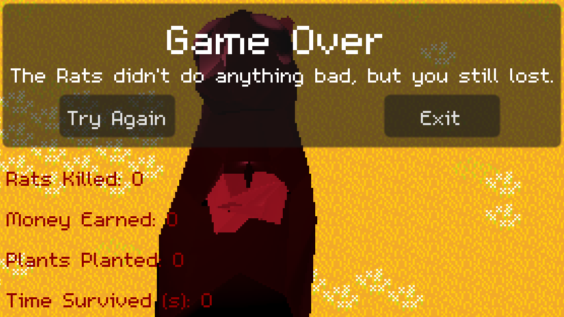 I made this game as a learning experience for both game dev and Godot, which is why I made this game with a large variety of different assets and systems. The rats are 3d model because I wanted to learn 3d modelling, I added lighting because I wanted to experiment with lighting, and so on.